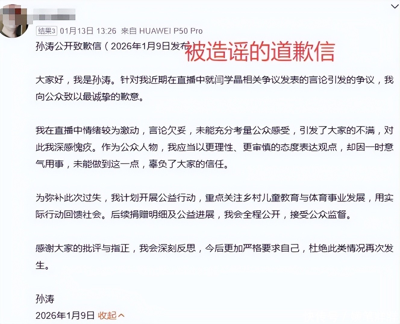 更有甚者,伪造一封所谓“孙涛致歉声明”,署名落款俱全,通篇充斥悔意与退让,强行安插于其个人主页评论区置顶位置,误导无数路人信以为真。