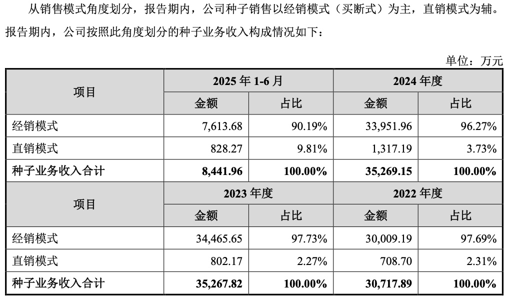 《招股书》显示,2022年-2024年、2025年1-6月,正大种业来自经销模式的收入分别为3亿元、3.45亿元、3.4亿元和0.76亿元,营收占比达97.69%、97.73%、96.27%和90.19%。