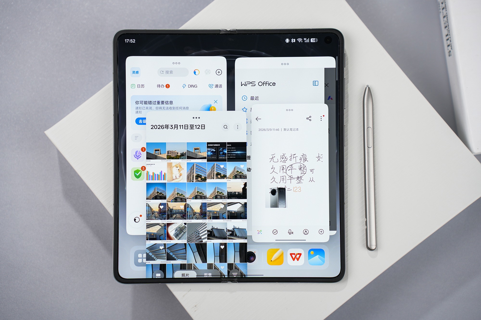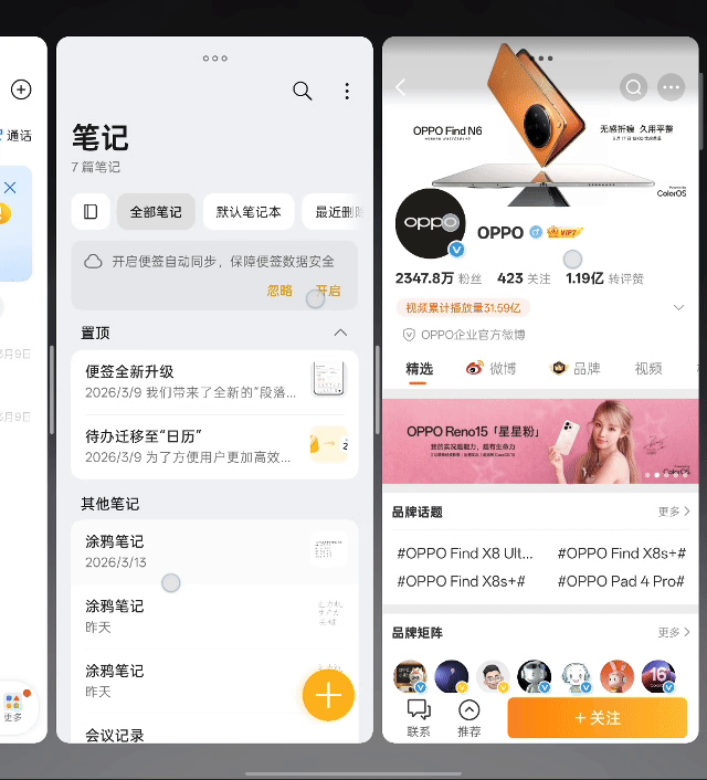 系统方面,Find N6搭载ColorOS 16,带来“全景自由窗”多任务方案,可自由调节窗口大小与位置,并支持多应用同时运行,提升大屏办公效率。同时,AI手写笔、AI一键闪记等功能进一步强化生产力属性,使折叠屏不只是大屏设备,更是高效工具。