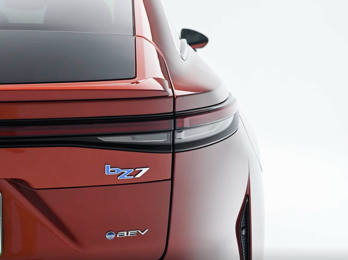 而来到侧面,新车的车顶线条很显顺滑,营造出经典的溜背轿跑姿态,更何况铂智7作为一款中大型车,它有着出色尺寸作为支撑,像长宽高分别为5130*1965*1506mm,轴距达到3020mm,这个身材会让整车侧面显得更为修长流畅,辅以20英寸多条辐轮圈,高级感与运动感兼顾。至于车尾,最大亮点是贯穿式尾灯组,内部结构不算复杂但点亮后效果不错,且在尾厢上方配备扰流板,也能够提升运动氛围。