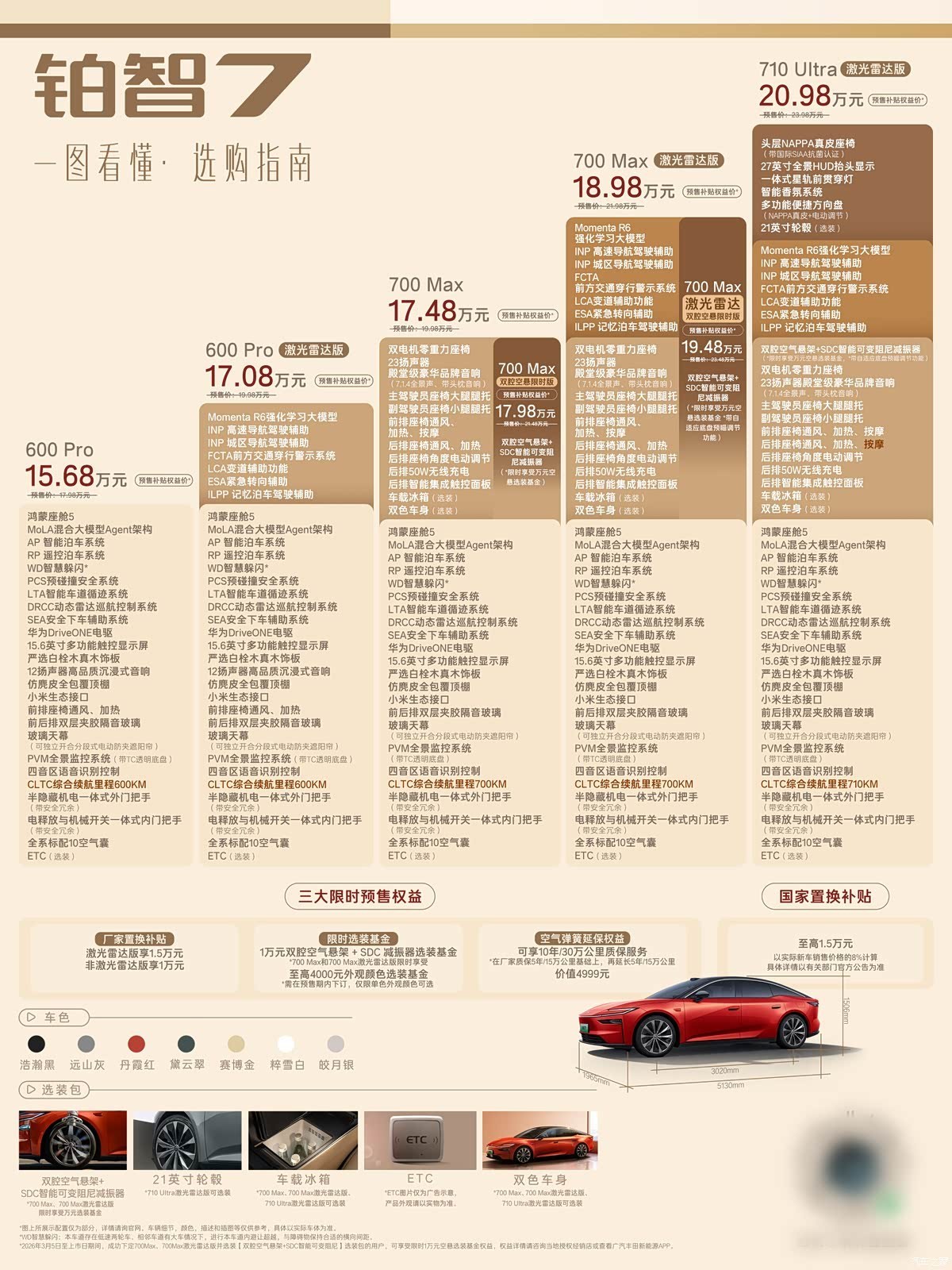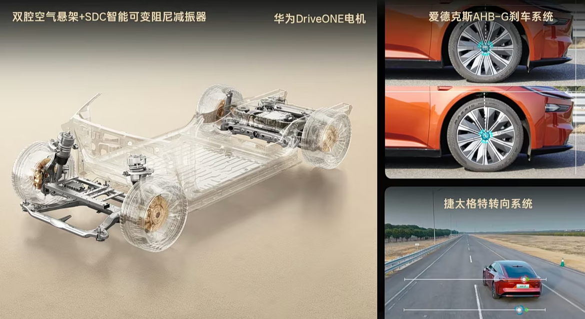 最后再看动力,铂智7搭载华为Drive One电驱,最大功率可达207kW,可惜官方没有透露加速成绩,结合车辆级别和重量,再看这个参数,我个人感觉百公里加速会在7秒左右,属于够用但不出色。再者电池容量有两种可选,但CLTC工况下至高可达710km,这同样不是一个出色的成绩,只能说在这个价位是主流水平。不过底盘方面倒是令人意外,新车竟然配备双腔空气悬架,这会让驾乘品质得到显著增强。